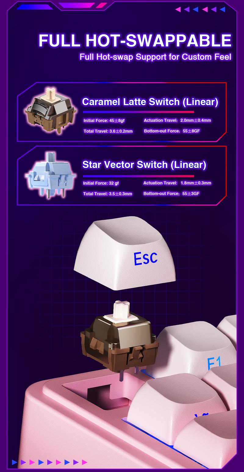 - Hot-swap Custom Keyboard: This mechanical keyboard with hot-swappable base supports 3-pin or 5-pin switches replacement(keycap/switch puller is included in the package). Even keyboard beginners can easily DIY there own keyboards without soldering issue. Equipped with pre-lubricated stabilizers and switches, the computer keyboard bring smooth typing feeling and pleasant creamy mechanical sound, providing fast response for exciting games(NOTE: Turn off the power to the keyboard when replacing the switch.)