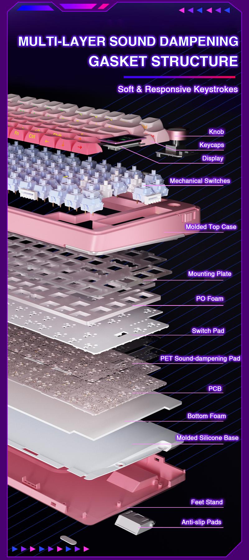 - Creamy Keyboard with Advanced Structure: The S75 Pro thocky keyboard features an advanced structure, extended integrated silicone pad, and PCB single key slotting, better optimizes resilience and stability, making the hand feel softer and more elastic. Five layers of filling silencer fills the gap between the PCB, the positioning plate and the shaft, effectively counteracting the cavity noise sound of the shaft hitting the positioning plate, and providing a solid feel