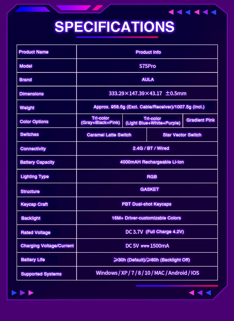 - 75% Compact Layout & PBT Keycaps: No matter the outlook, the construction, or the function, AULA S75 Pro keyboard is definitely a professional gaming keyboard. This 80-key 75% layout compact keyboard can save more desktop space while retaining the necessary arrow keys for gaming. These side-engraved PBT keycaps take double injection molding and heat sublimation process, which are more durable without fading, sweat-proof, and softer to the touch.